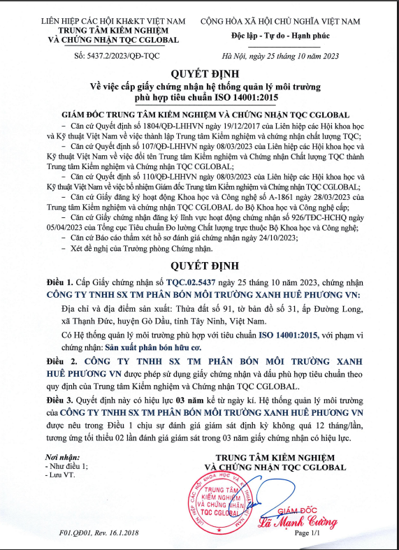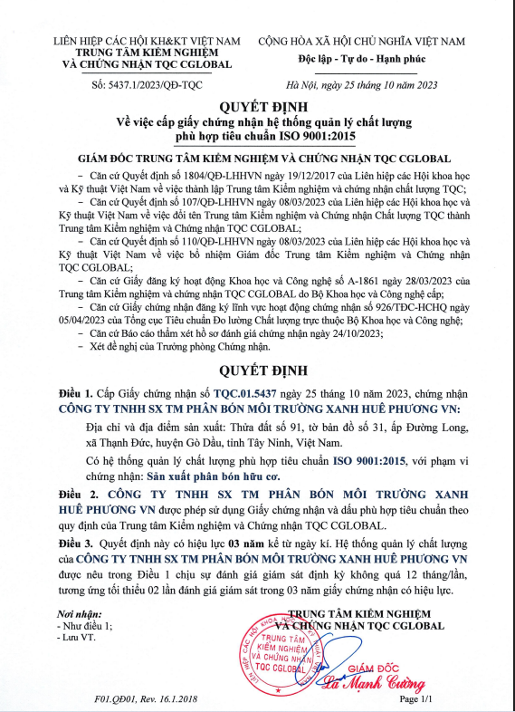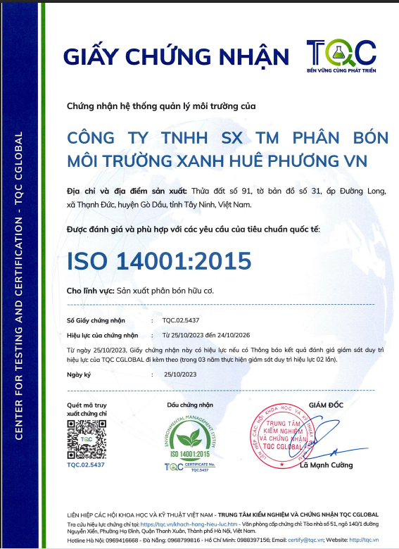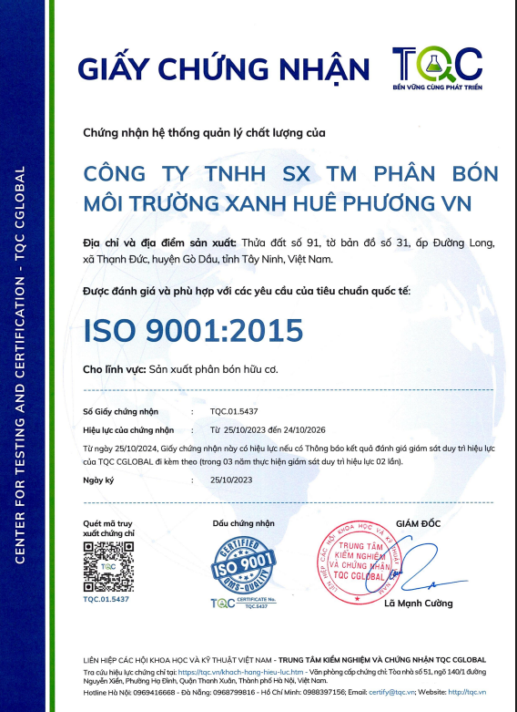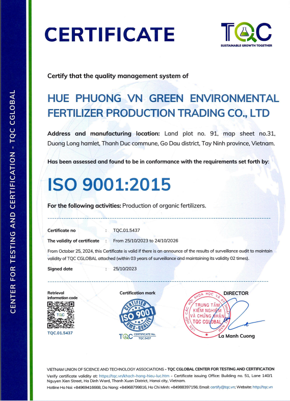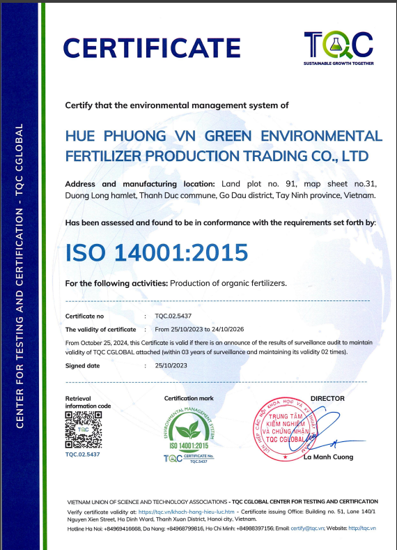 - Tiêu chuẩn chất lượng: Đạt chuẩn các tiêu chuẩn quốc gia về phân bón hữu cơ ( Iso 14001:2015…)